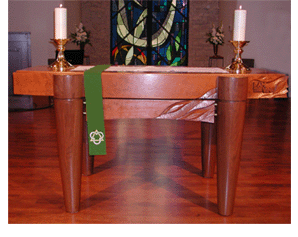 Communion Tablewood:Cherry description:This was designed by a fellow craftsman, Tim Bergen, who hand carved the piece as well but the construction was built by myself. |