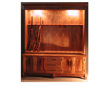 Gun Cabinetdimensions:77"W x 85"H x 22"D wood:Walnut description:Arts & Crafts style. Solid walnut with door panels and friezes contrasting crotch walnut. This piece houses 12 rifles. Door pulls fabricated from empty cartridge casings. Upper doors sliding clear plate glass. |