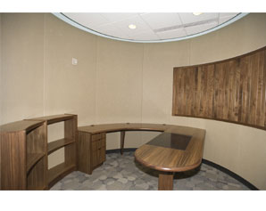 Round OfficeWoodWalnut descriptionThis is the first office that I have gone round and round with ! There are no square corners. The window coverings were constructed with tongue and groove, the bullet desk has a solid surface insert. |