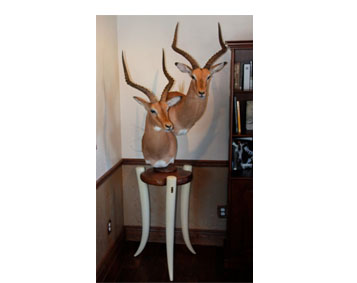 "Here is a picture of my pedestal mount of impala my wife and I took in South Africa in 2008. I am so impressed with Fine Ideas Furniture. They were able to work directly with my taxidermist to create this mount that looks absolutely perfect along with my campaign furniture I got from them. What an amazing company and I can't wait to work with Dan and Susie again for my sable mount." Marc |