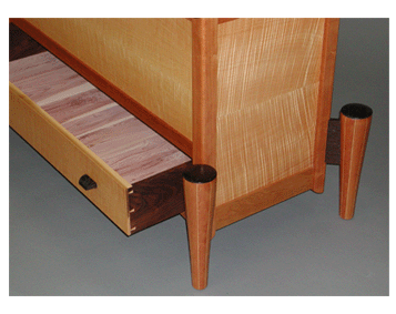 Hope Chestdimensions:21"W x 46"L x 27"H wood:Fiddle Back Maple, Cherry, Wenge & Cedar description:A fun whimsical piece we call "launched" since it was made for a graduating high school senior and the legs resemble rockets! Contemporary style with Arts & Crafts influence. This blanket chest is lined with cedar. Pulls and accent are Wenge. |