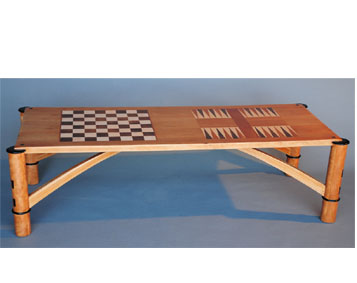 Game Tabledimensions:24"W x 60"L x 18"H wood:Cherry and Ebony description:Contemporary design, with under girding components. Inlay portions for chess & backgammon made with maple & walnut. Custom built for Serranos Cofee House. |