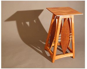 Large Flared Shield Pedestaldimensions:36"H x 18" W at base, with a 19" top description:Unique design with African influences, Solid Mahogany top and legs. The shields are veneered with "Sapele" or could be other wood species. Click here to view pedestal in Oak, with ebonized shield. |