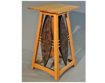 Unique design with African influences, Solid Oak top and legs. The shields are veneered with ebonized oak burl or could be other wood species.