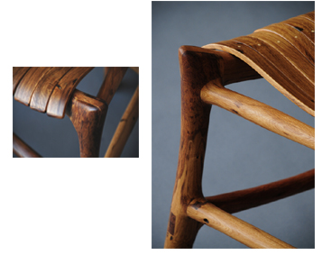 Chair - entitled "Sit!"wood:Scrub Oak description:The knobbly and crooked trunks of the gambel oak are fashioned into an elegant chair while still retaining the wild memory of the unruly scrub oak patch. "Sit!" now serves a different purpose. To give you rest. Click here to see detail of the back. |