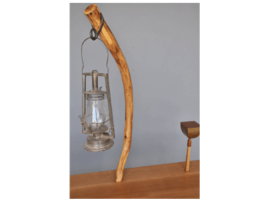 "Pierced" Entry Table or Sideboarddimensions:60"W x 16"D x 26"H and 63"H to top wood:Quarter Sawn Oak, ebonized rungs, scrub oak pole holding antique lamp. Steel candle stands on either side. description:An Arts & Crafts style piece, perfect as a hall entry table. Initially inspired by some scrub oak I found growing in the woods, which now penetrates through the surface to hold the lantern.- piercing the darkness with light.. |