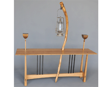 "Pierced" Entry Table or Sideboarddimensions:60"W x 16"D x 26"H and 63"H to top wood:Quarter Sawn Oak, ebonized rungs, scrub oak pole holding antique lamp. Steel candle stands on either side. description:An Arts & Crafts style piece, perfect as a hall entry table. Initially inspired by some scrub oak I found growing in the woods, which now penetrates through the surface to hold the lantern.- piercing the darkness with light.. |