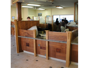 Teller Line for BankWoodQuarter sawn Walnut Veneer front panels with Claro Walnut accent rectangles. Posts made with Quarter sawn White Oak. Tunis Green granite for the countertops. descriptionThis was a fun commercial job, in that I had the opportunity to design and implement something different! |